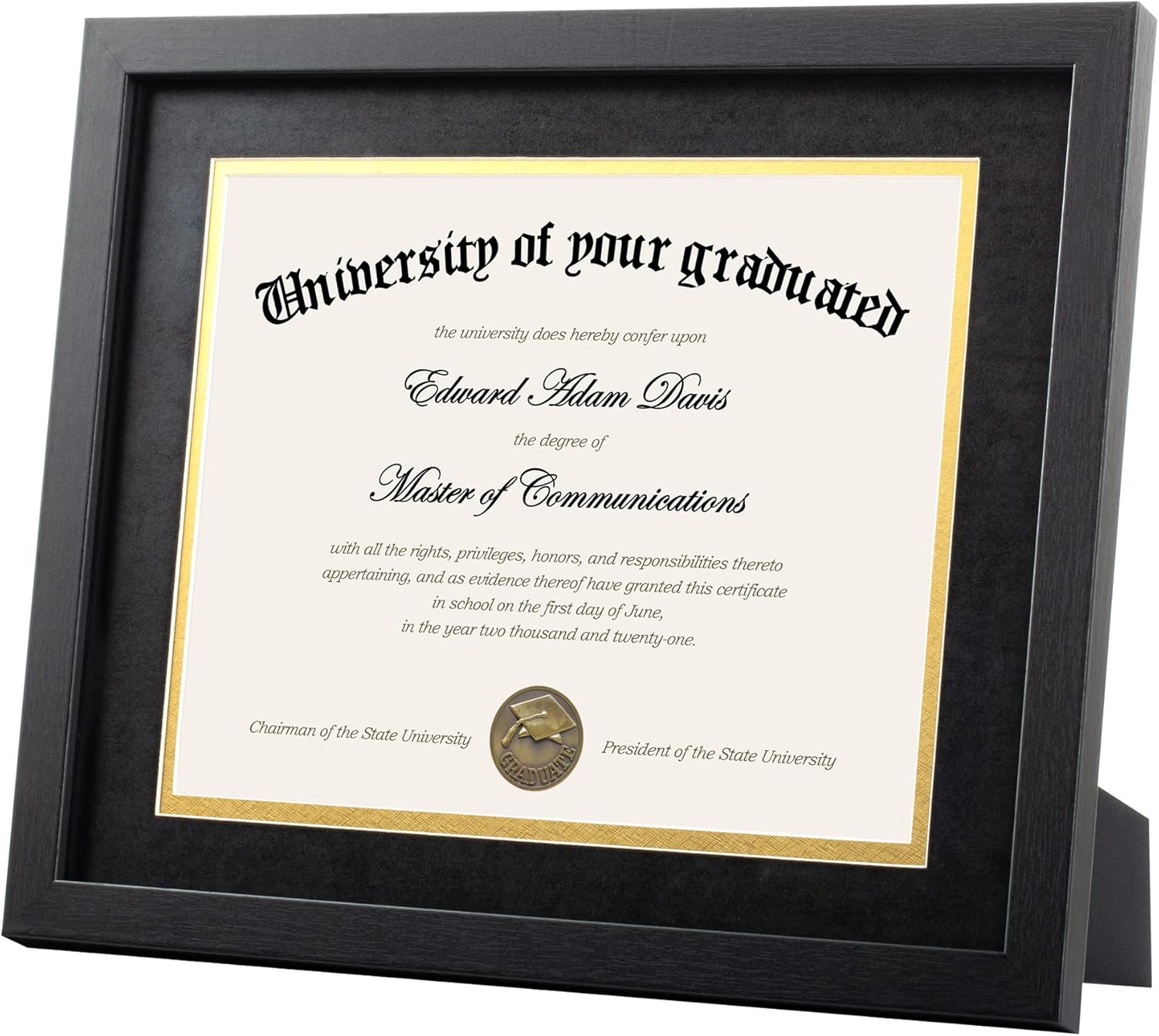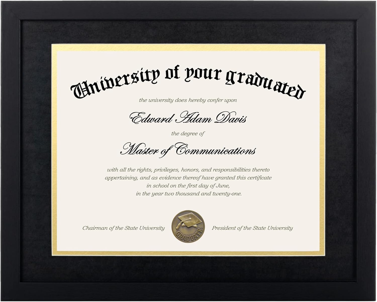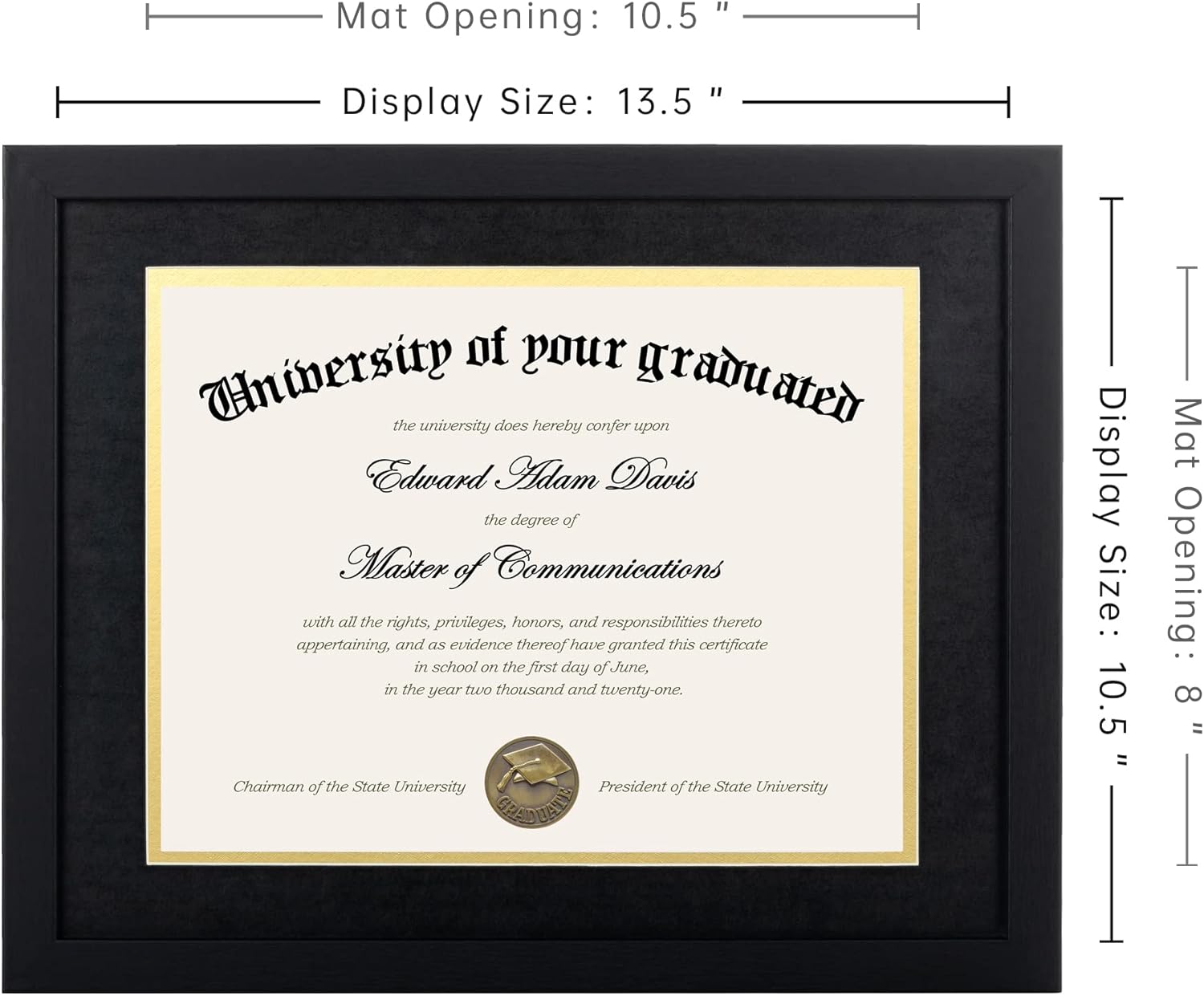 - DESIGN: Diploma Frames 8.5 x 11 with mat or 11x14 without mat. The actual mat opening is 8x10.5 inches in order to hold diploma strongly. Black picture frames with black and gold mats let diploma a clear view.