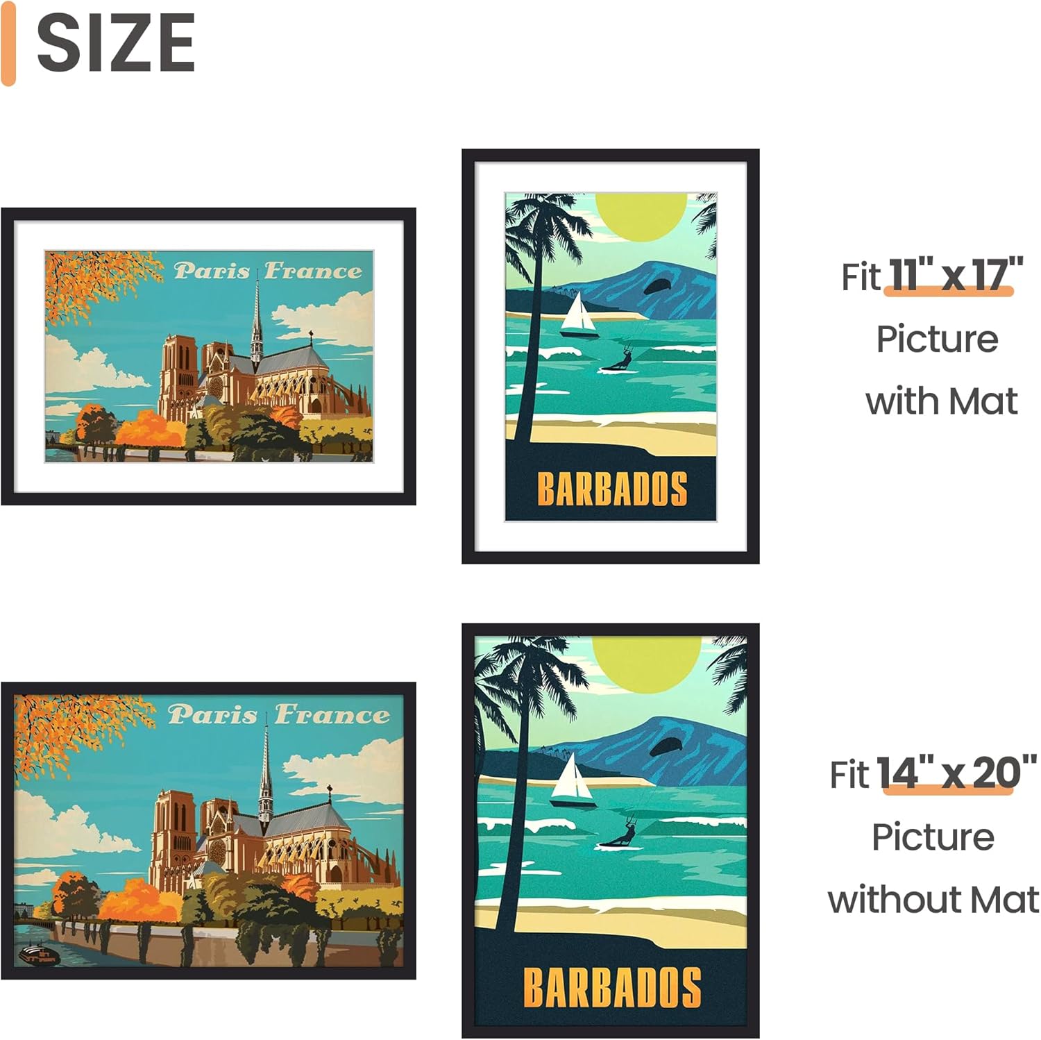 • DOUBLE SIZE DESIGN: Black 14x20 inch poster frame perfects fo Picture 11x17 with Mat or 14x20 Without Mat. The display size will be 0.5inch smaller than the photo size to better stable the photo and prevent it from falling off.
